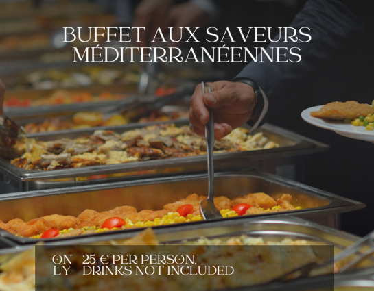 An all-you-can-eat buffet featuring traditional mediterranean dishes, priced at €25 per person (drinks not included), and available by reservation only.