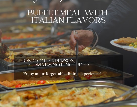 Un buffet à volonté composé de plats méditerranéen traditionnels, au prix de 25 € par personne (boissons non comprises), disponible uniquement sur réservation.